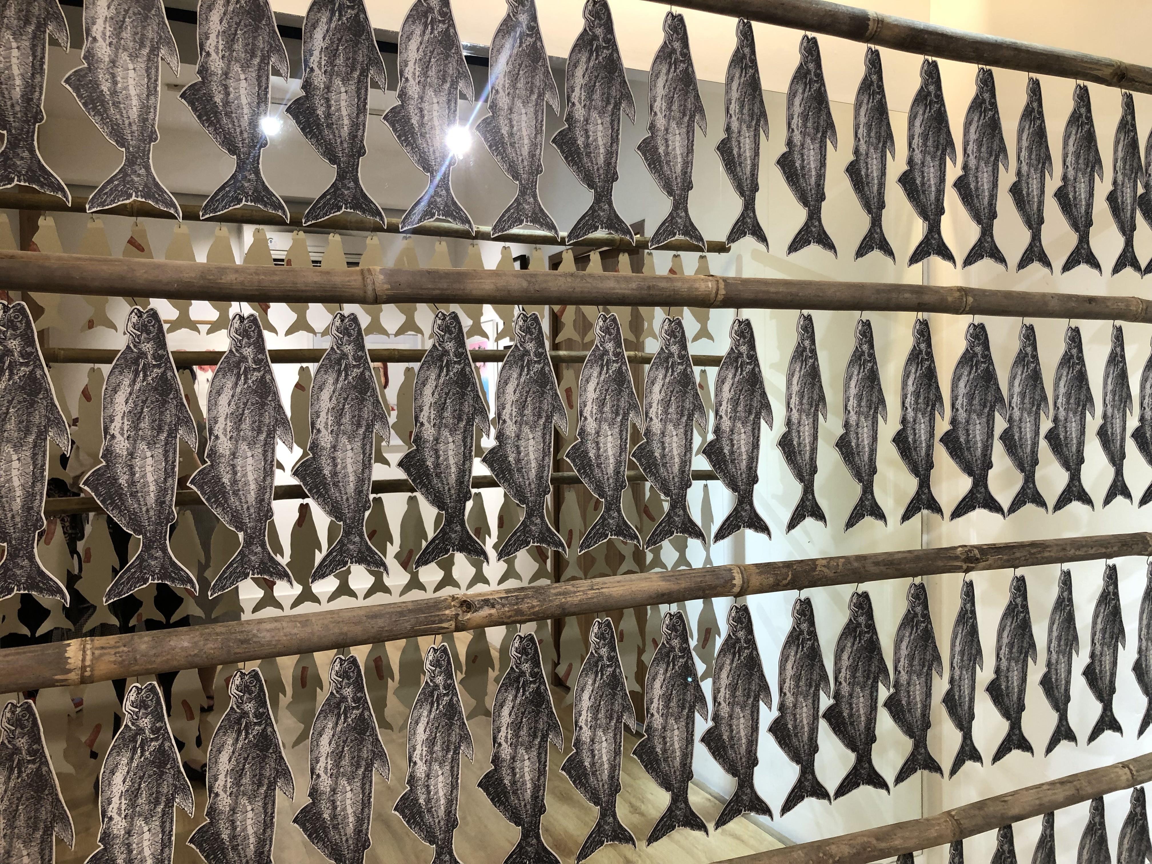Rata-rata lukisan cantik itu dibungkus dalam pigura. Tapi, di ujung dalam gallery, Anda akan menemukan karya berbentuk ikan-ikan yang digantung pada rak bambu, bagai ikan asin yang sedang dijemur di tepi pantai. Cermin besar diletakan di belakang karya Adi Sundoro ini. Jika Anda perhatikan, bagian belakang dari ikan-ikan terdapat gambar potongan jari manusia. Menurut saya ini adalah karya terunik dalam pameran ini, karena bentuknya berbeda dan presisi antar ikan satu dan lainnya begitu rapih. ‘Behind the Fishes’ menggunakan teknik reproduksi untuk menghasilkan bentuk die cut yang seragam. Karya yang mengingatkan saya akan cerita tahun 1965, tepatnya pembantaian kaum komunis massal di Indonesia.