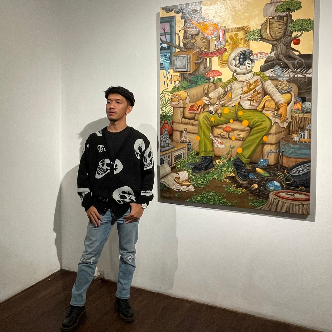 Pada saat memasuki ruang pameran, pengunjung akan disambut oleh lukisan Iwan yang menggambarkan tokoh utamanya, yakni manusia dengan helm luar angkasa, menggandeng kuda, hingga ada yang jatuh dari dunia sambil menggendong gunung. Mungkin dari awal masuk ini, pengunjung akan langsung berpikir apa maksudnya? Iwan ingin menggambarkan tentang efek kemajuan teknologi dengan limbah yang diciptakan. Menurut saya, ini sangat realistis dengan apa yang terjadi sekarang.