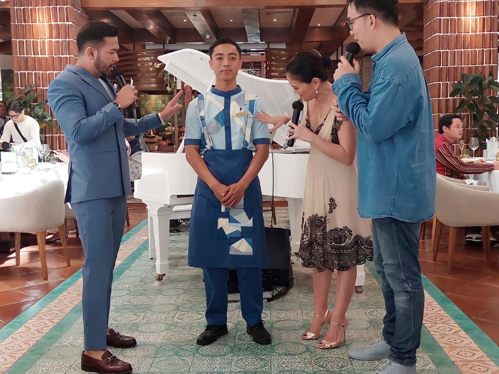 Uniknya, acara kemarin tidak hanya membahas tampilan resto dan rasa hidangannya, tapi juga sampai ke seragam yang dikenakan tim Cucina. Perpaduan warna biru muda, biru tua, dengan sentuhan warna putih pilih Adrie Basuki sebagai perancang, karena terinspirasi dari pemandangan langit dan laut Positano, Italia. Selain modis, karena seragram ini dirancang oleh seniman Indonesia yang ahli menggunakan kain perca, bahan rayon katun daur ulang yang digunakan dapat meminimalkan dampak lingkungan.