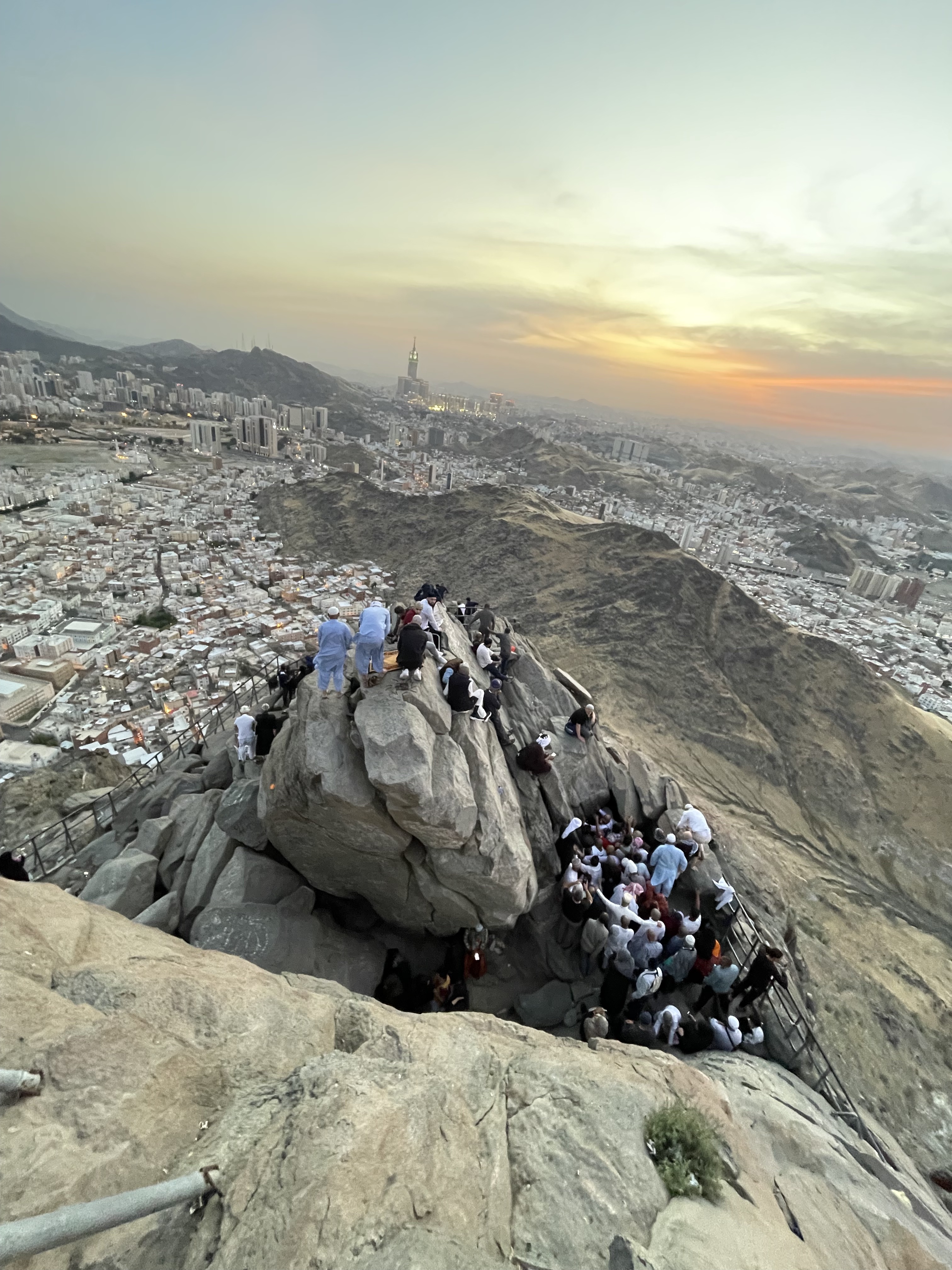 Waktu yang sudah mendekati azan Maghrib pun, perlahan semakin gelap. Dan dari kejauhan mulai tampak pendar-pendar cahaya dari perkotaan. Semakin mendaki dan semakin tinggi maka semakin mendekat pula dengan Gua Hira. Dan perlahan mulai tampak para peziarah yang hadir melakukan sholat dari atas ketinggian. Dan Indahnya lagi posisi Zam-Zam Tower yang menjulang di kota Mekkah itu dapat dilihat langsung dari Gua Hira yang berada di puncak Jabal Nur setinggi 640 meter ini. Artinya kita dapat langsung mengetahui dimana posisi Ka’bah.