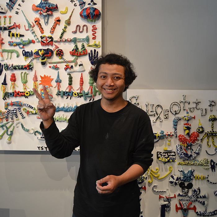 Terik matahari dan biru langit menemani saya hingga tiba di sebuah galeri bernama Ruang Dua Sembilan, kawasan Grogol, Jakarta Barat. Ketika melangkah masuk ke dalamnya, saya disambut oleh banyak karya seni keramik yang rencananya akan dipamerkan tiga hari setelah kunjungan saya itu. Seisi galeri terlihat berantakan, namun hal itu membuat saya lebih merasa seperti sedang berada di ruang bermain anak-anak, ketimbang di sebuah galeri seni yang kerap terkesan formal. Saya sampai harus merasa berhati-hati dalam melangkah. Tetapi, "kalau rusak, ya tinggal dibetulkan, nggak usah terlalu pusing," kata sang seniman dengan santai.