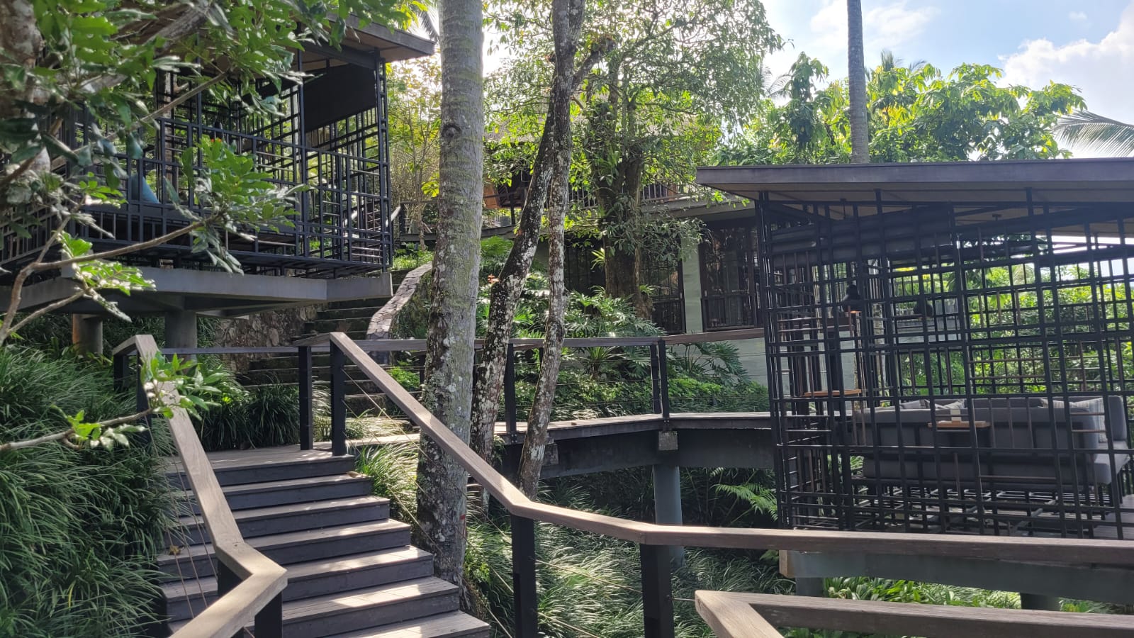 Kita juga tidak perlu khawatir untuk urusan perut. Meski hanya memiliki satu restoran eksklusif hanya untuk tamu yang menginap, kita bisa bebas memilih untuk menikmati makanan pilihan kita dimana saja asal masih di dalam lingkungan resor, selain di dalam restorannya sendiri. Kita bisa memilih duduk di bagian tepi lembah, bisa duduk di pendopo, atau di gazebo-gazebo yang terlihat menggantung dan tersebar di lembah yang berujung pada sungai.