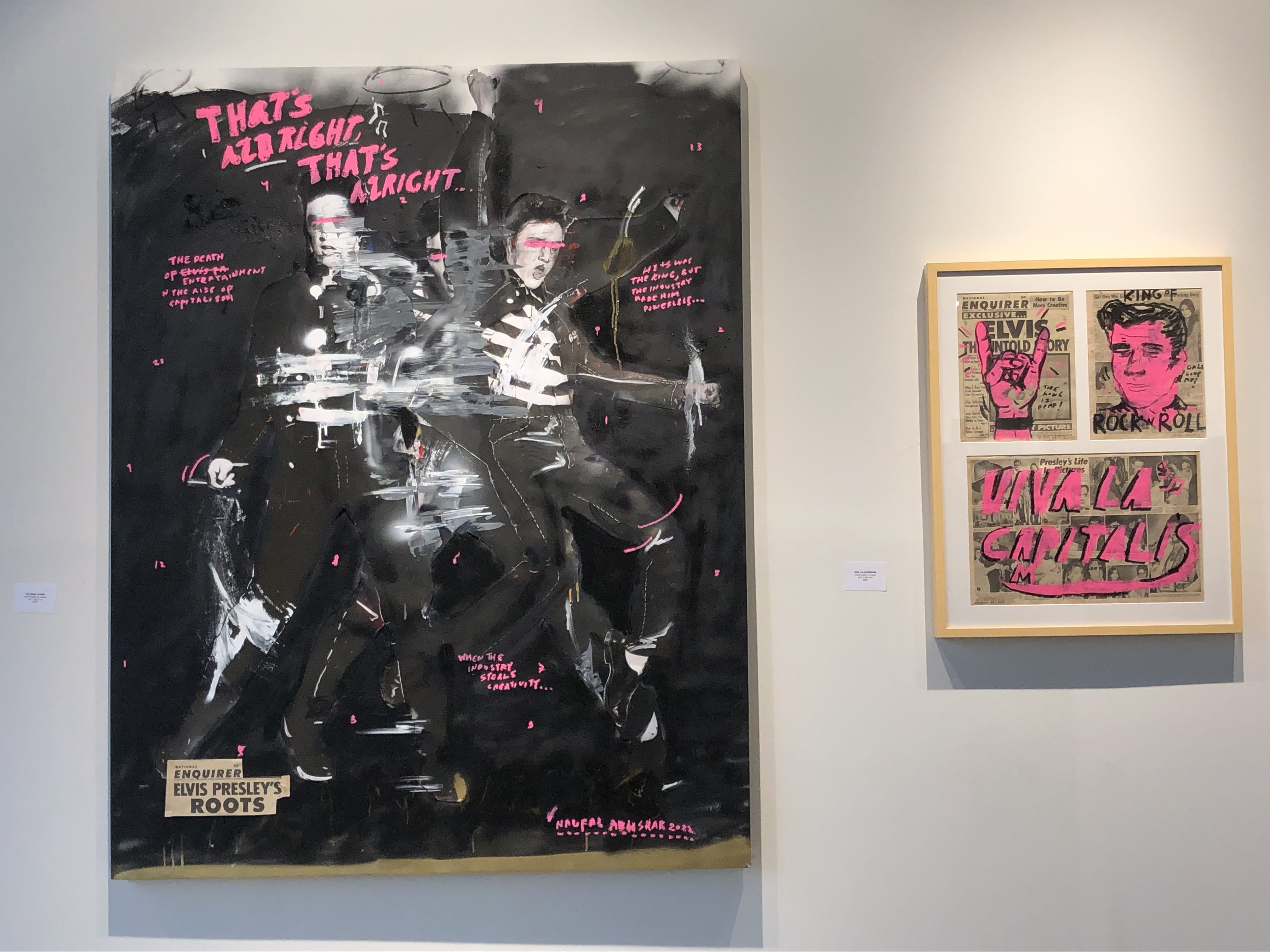 Lalu ada juga gambar Elvis Presley yang dibuat blury. Menariknya, sosok Elvis ini digambarkan sedang menari dengan gaya khasnya. Elvis adalah legend yang hancur karena dunia entertaiment yang begitu kejam. Ada juga gambar Elvis yang naufal gambar di atas kertas koran.