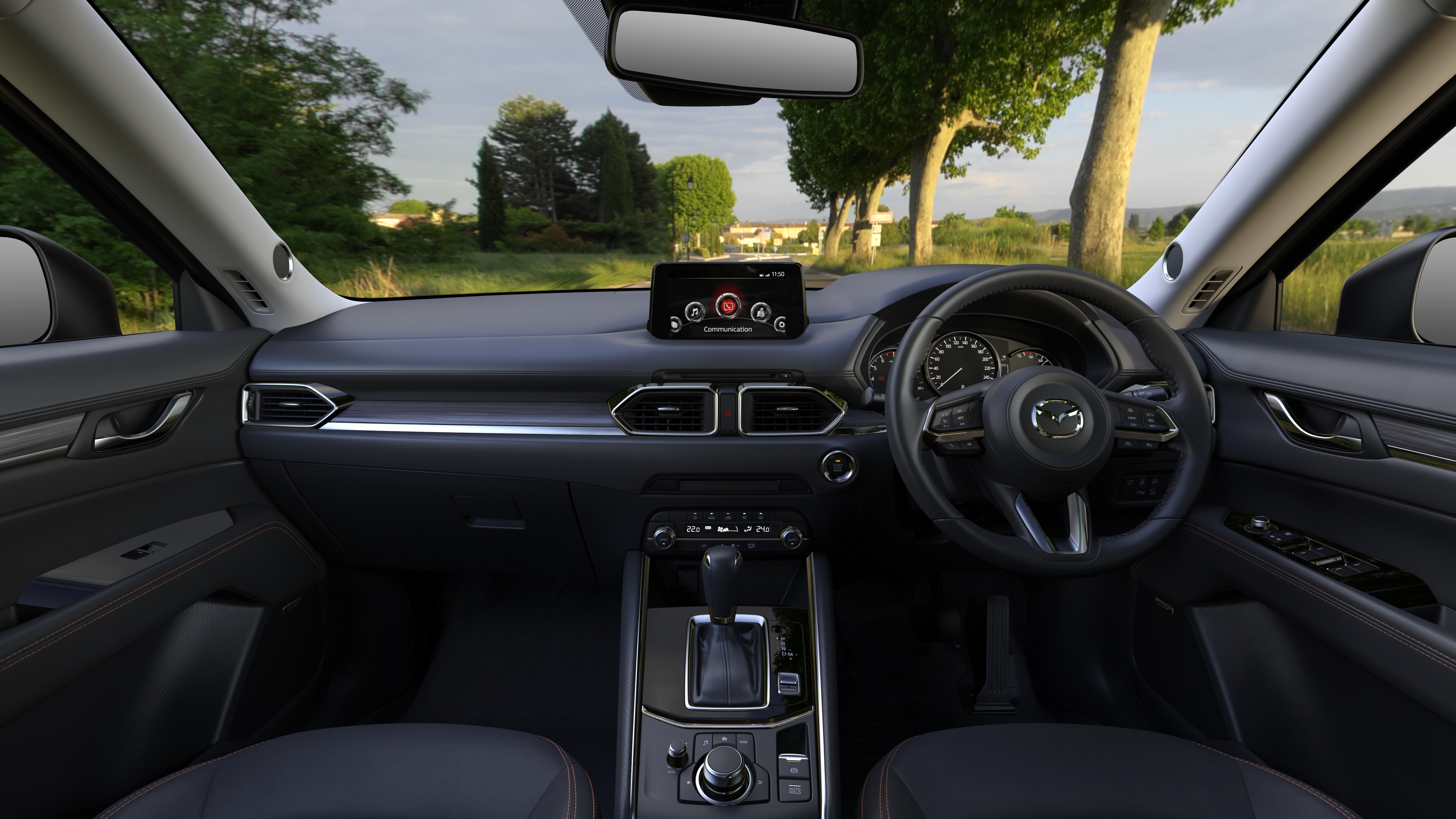 Dari bagian depan, dibawah emblem Mazda, terdapat kamera depan 360. Saat memasuki bagian dalam, kamu akan mendapatkan kabin yang kedap. Pada saat perjalanan dimulai, kamu akan merasakan mesin 2500CC, 4 silinder Skyactiv-G. Kebutuhan sehari-hari seperti charging, membuka bagasi, keselamatan, diperhatikan oleh Mazda. CX-5 dilengkapi dengan fitur wireless charging (Qi), hands-free power liftgate, hingga teknologi keselamatan i-ACTIVSENSE, yakni technology dari Mazda