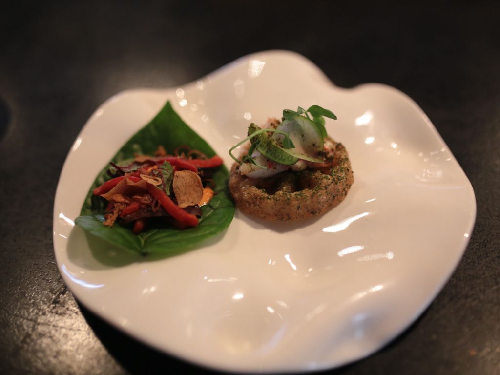 Pertama kita dihidangkan Hokkaido King Crab dan Ox Toungue yang dihidangkan dalam satu piring. Ox Toungue disajikan menggunakan daun sirih yang diatasnya berisikan daging empuk, lembut, dengan potongan tipis serta ditaburkan paprika merah diatasnya. Disantap menggunakan tangan, daging kita bungkus dengan daun sirih, bagai makan daging bakar ala korea.