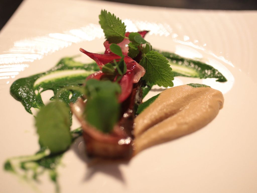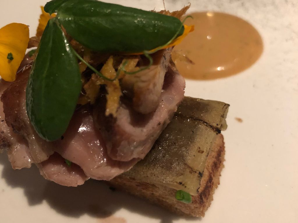 Memasuki hidangan utama, Chef Adit memulai dengan Chilian Seabass. Tekstur ikan yang lembut, asin dan garing dibagian kulit ikannya, ditambah potato gnocchi dengan tekstur yang kenyal, jamur morel, lalu ada rasa unik dari puree kacang hijau dan truffle. Chef Adit juga memberikan keripik pisang di atas sajian.