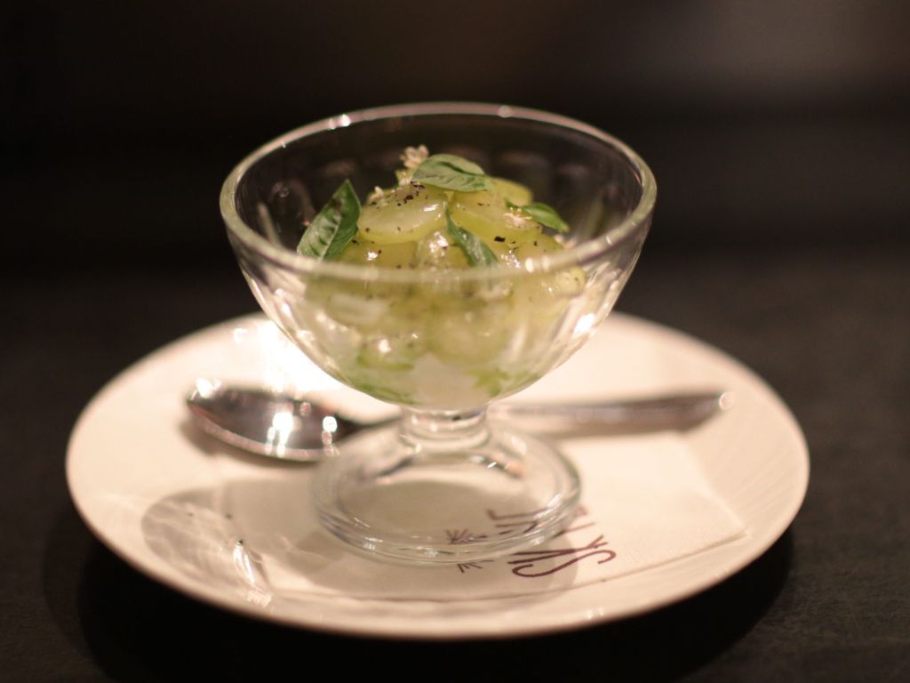 Setelah beberapa lama menunggu, hidangan selanjutnya ada White Grapes Granita yang manis segar dengan daun basil.