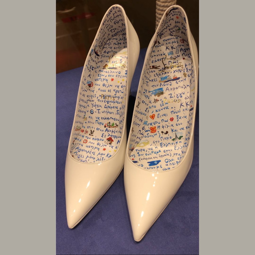 Salah satu sepatu yang menarik perhatian saya adalah heels putih yang pada bagian dalamnya berhiaskan tulisan surat dari Louboutin. Pada saat dipakai, orang akan melihatnya seperti heels putih biasa, namun pada saat melepaskan sepatunya, orang akan melihat tulisan berwarna biru dengan beberapa gambar-gambar kecil seperti love, kapal, dan menara eiffel pada dalam sepatu.