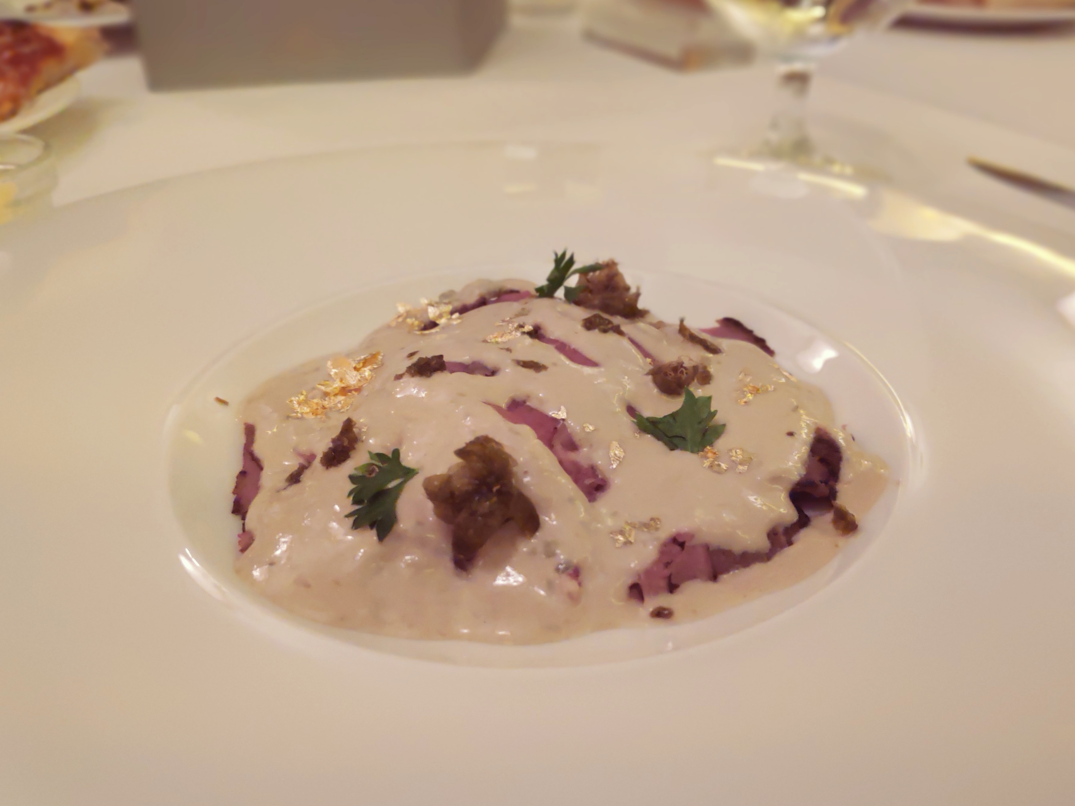 "Vitello Tommato" roasted veal with tuna sauce and capers, with gold flakes